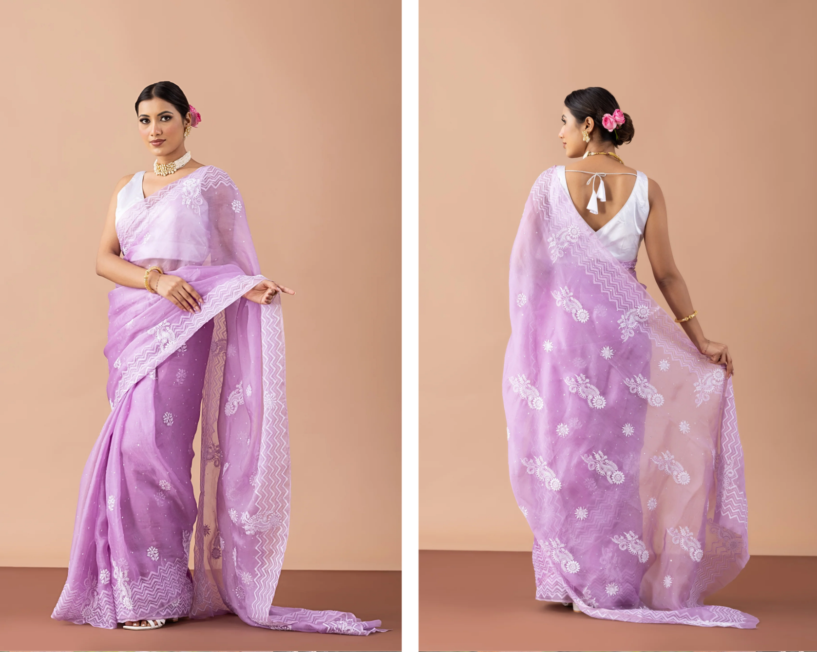 For example, chiffon flows effortlessly, organza holds structure, and tissue silk has a crisp finish. If you prefer comfort for long hours, lightweight fabrics may be more suitable. For formal events, structured silks often work better.