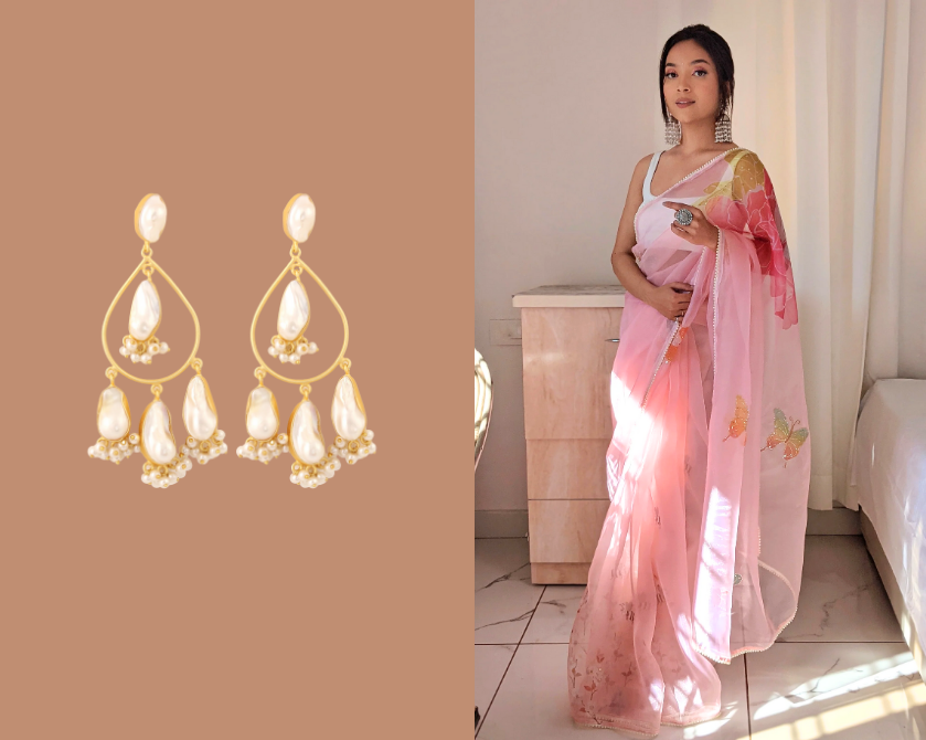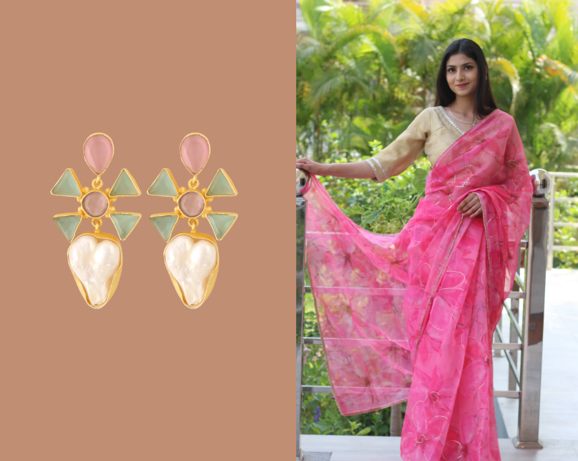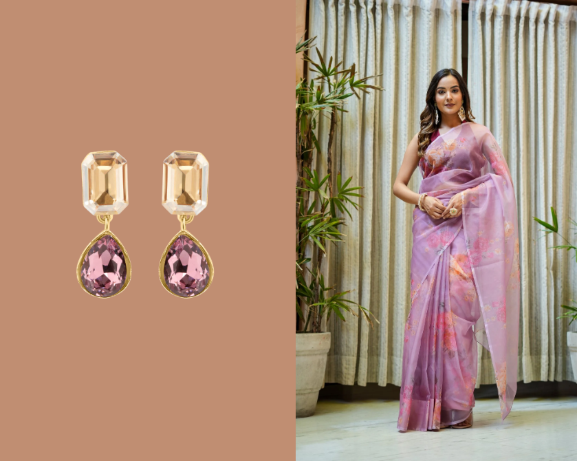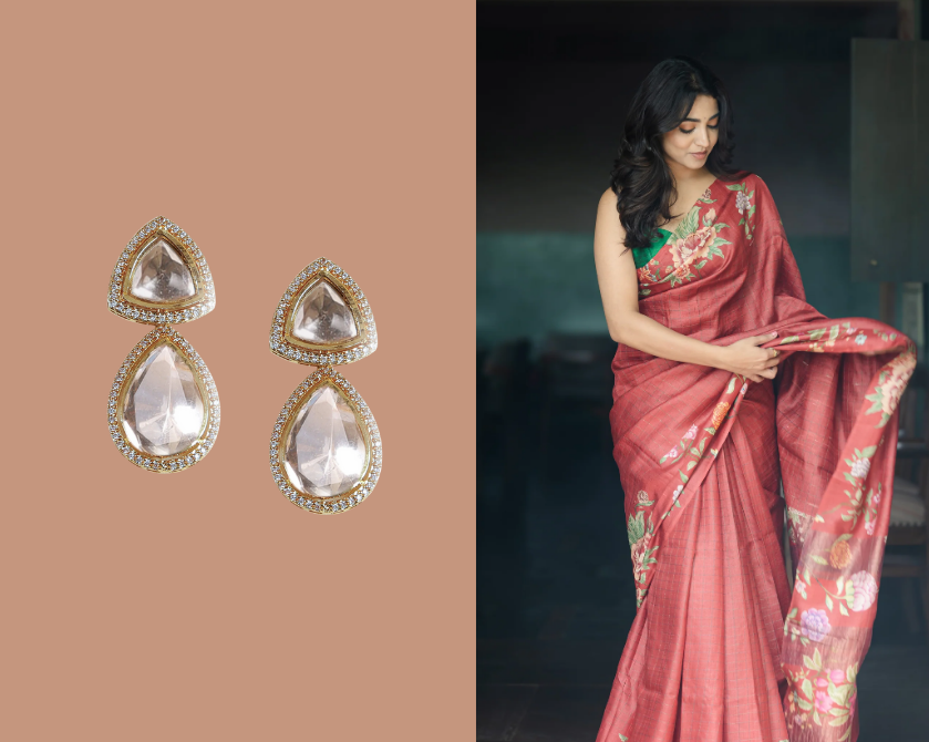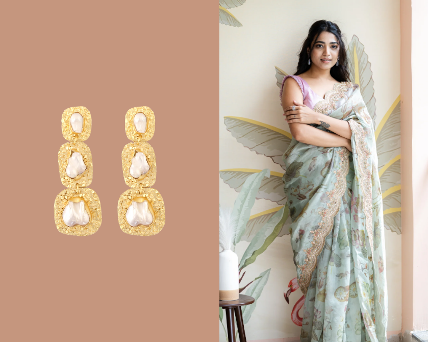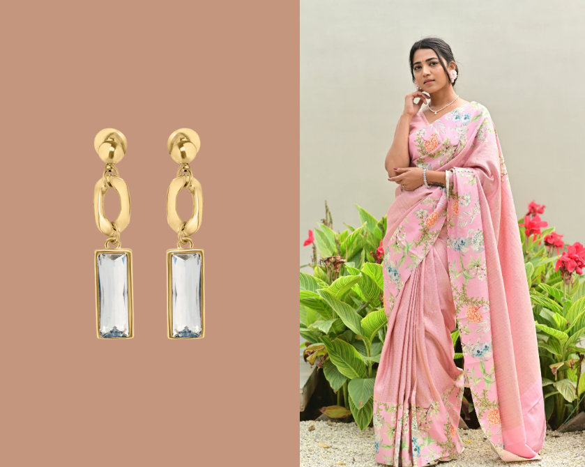 For daytime or casual occasions, less is more. Printed sarees styled for work, brunches, or casual outings look best with lightweight jewellery such as: