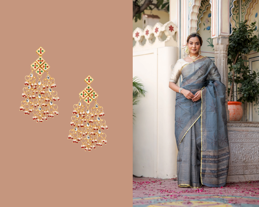 The blouse is an often-overlooked factor in jewellery balance. A heavily designed or printed blouse calls for simpler jewellery, while a plain or solid-coloured blouse allows room for slightly bolder accessories.