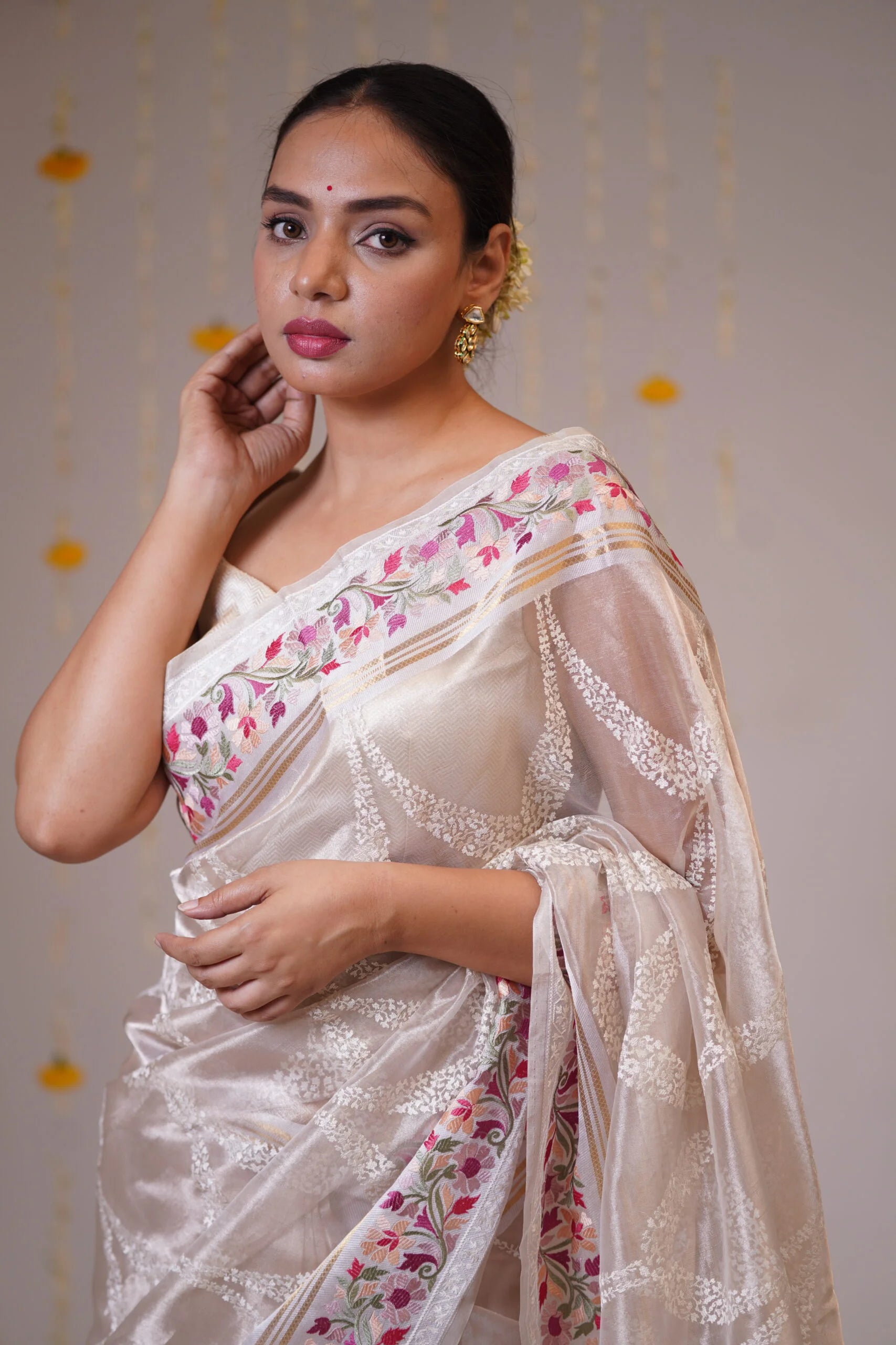 Alluring yellow light brown organza handpainted hand embroidered saree floral